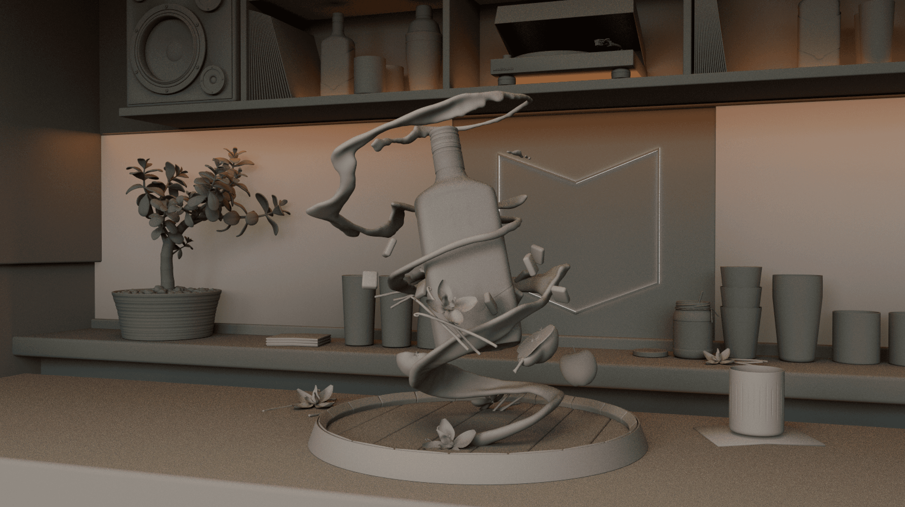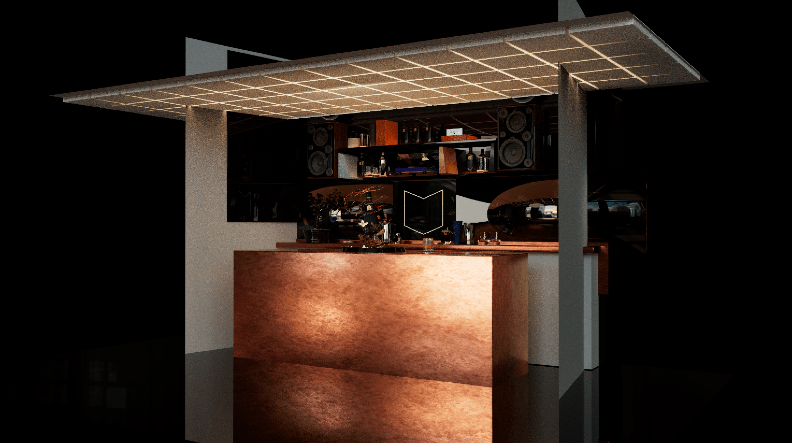 This project involved extensive research and development, including my first exploration of fluid simulations in Cinema 4D. Building the scenes was more straightforward, but achieving realism required careful study of real bar environments to guide the design, materials, and lighting.