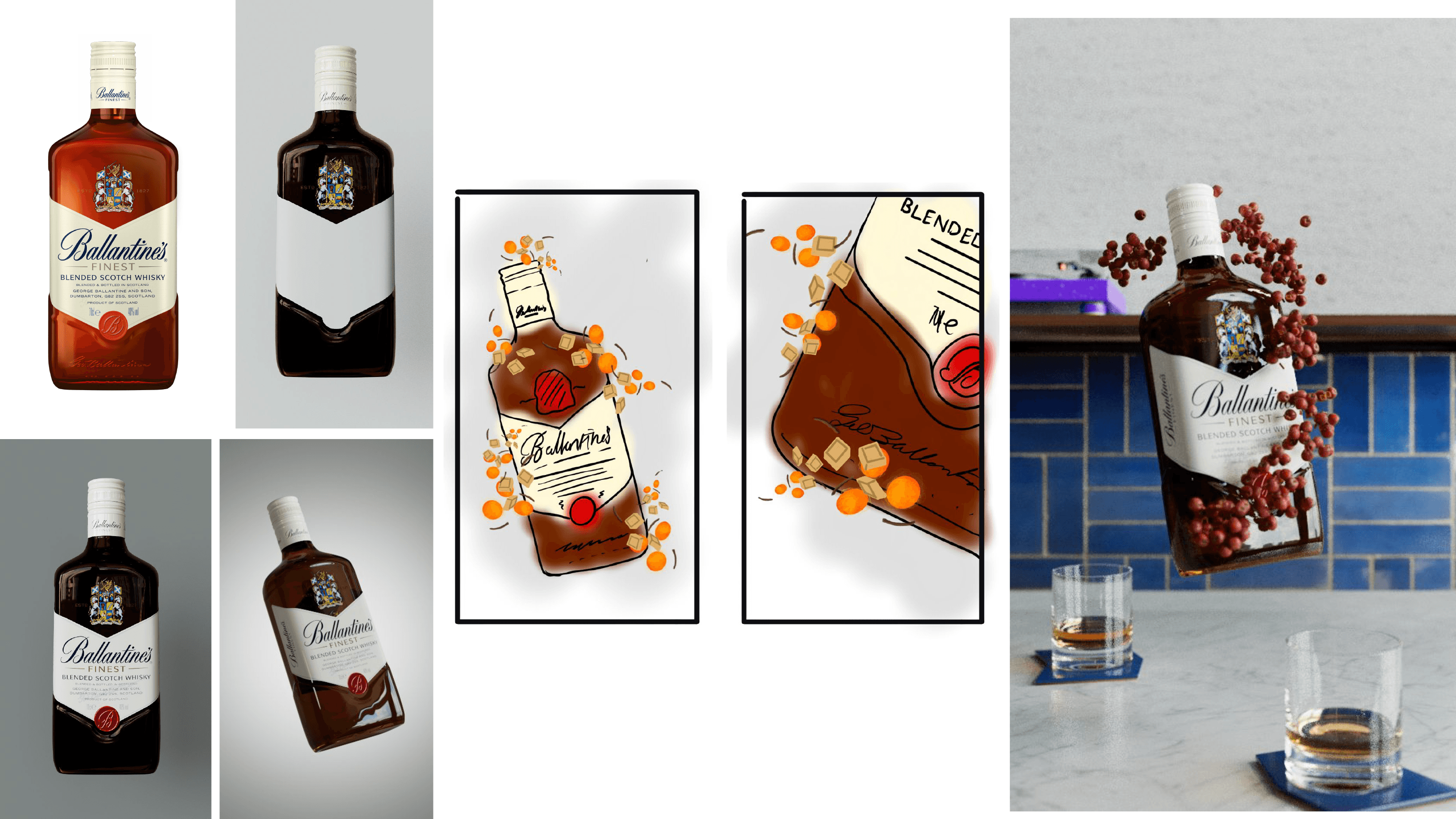 The project began by creating accurate digital twins of the bottles from reference material, which then informed the design of bespoke 3D environments that reflected each product's personality.