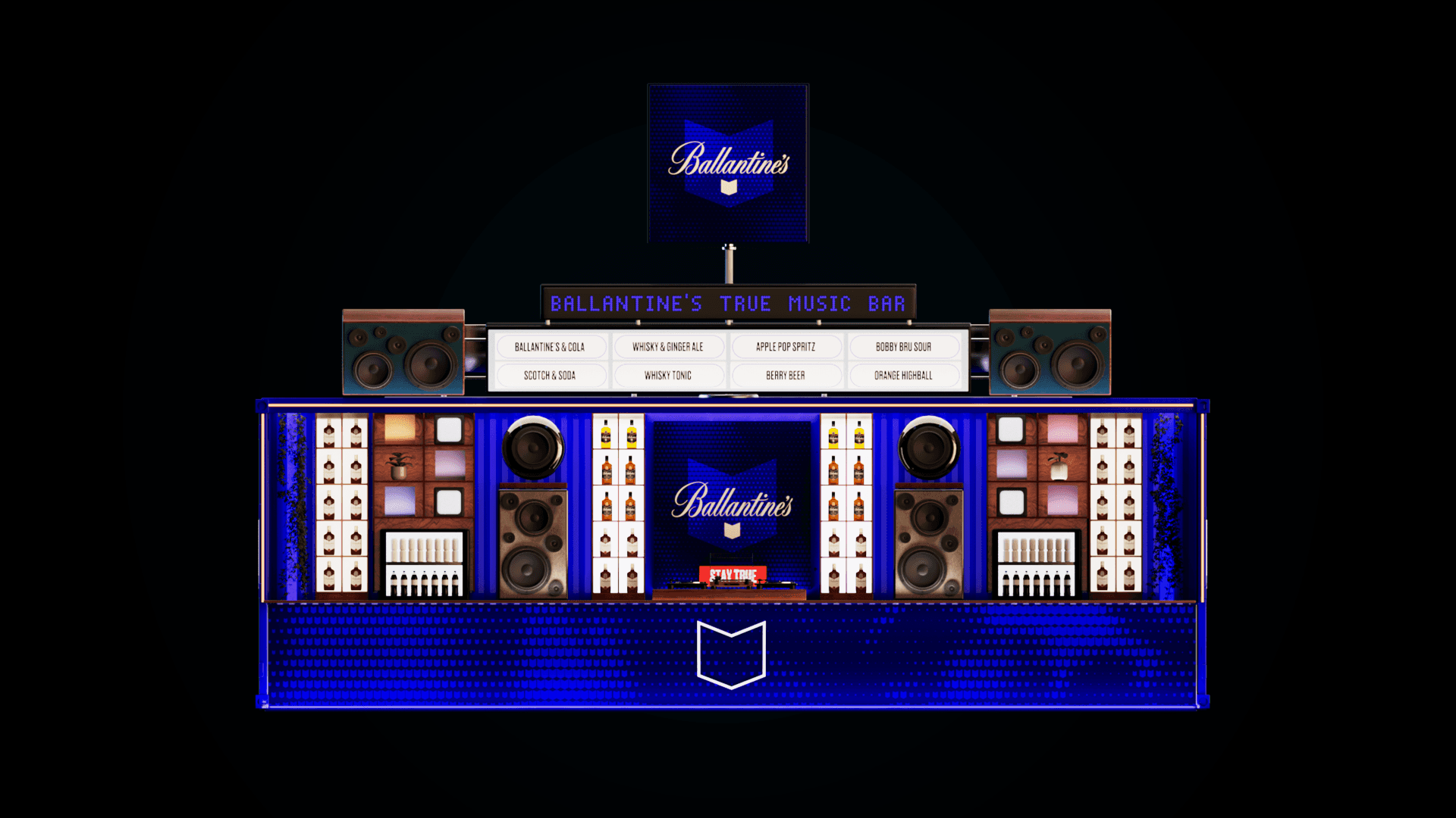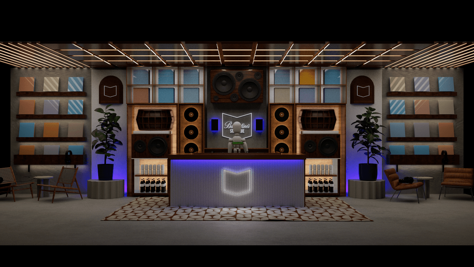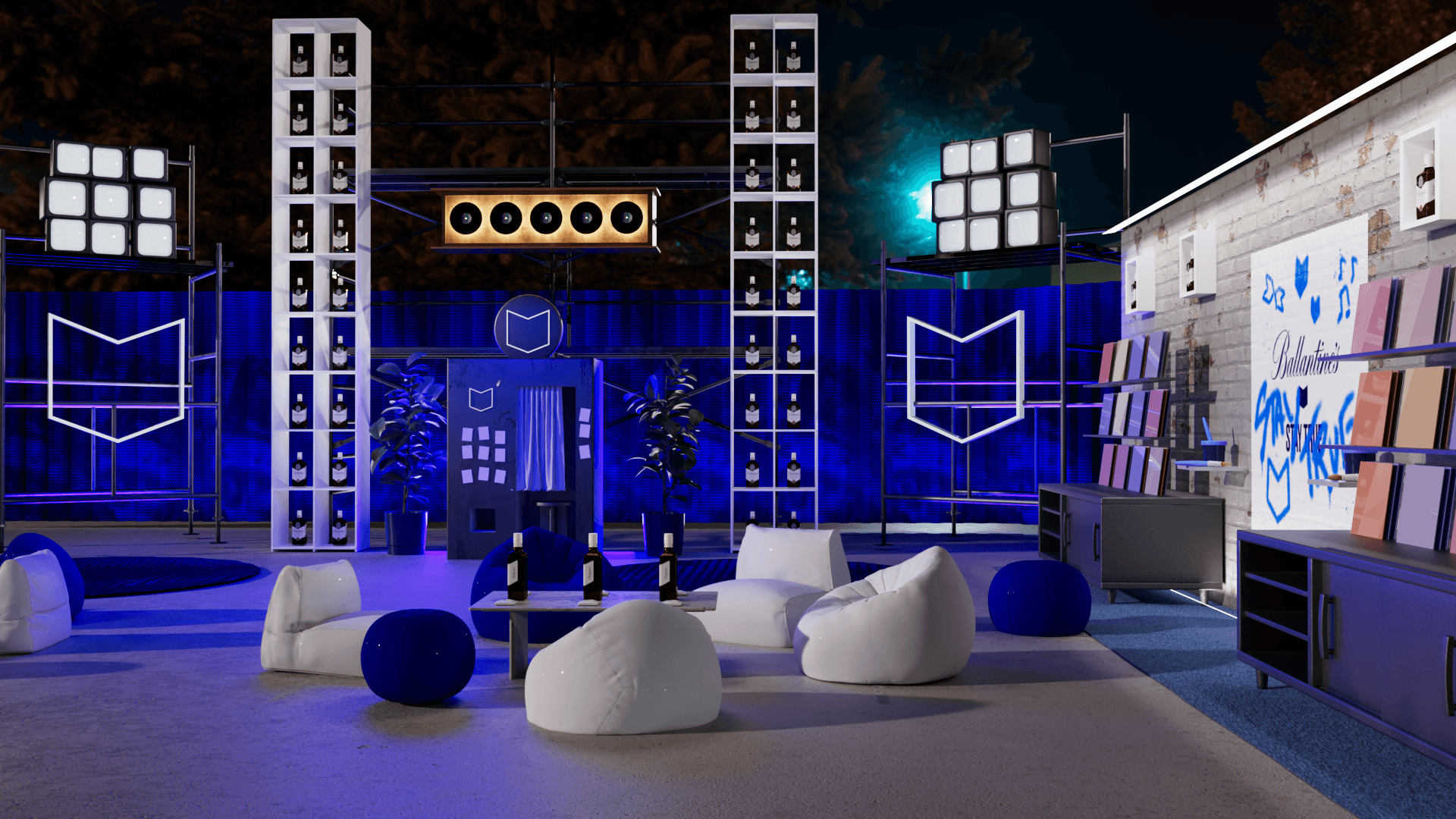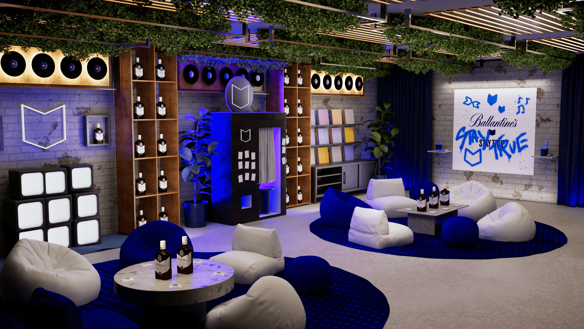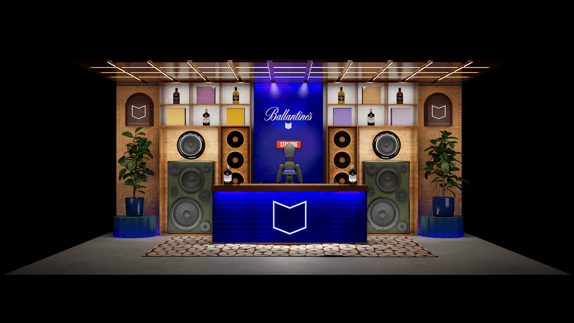 From that foundation, the experience grew. Gaming suites, chill zones, and a central DJ booth each required their own spatial logic while remaining cohesive within the wider brand world. Each space was designed to feel distinct but unmistakably Ballantine's, with materials, lighting, and layout working together to create atmosphere without sacrificing practicality.